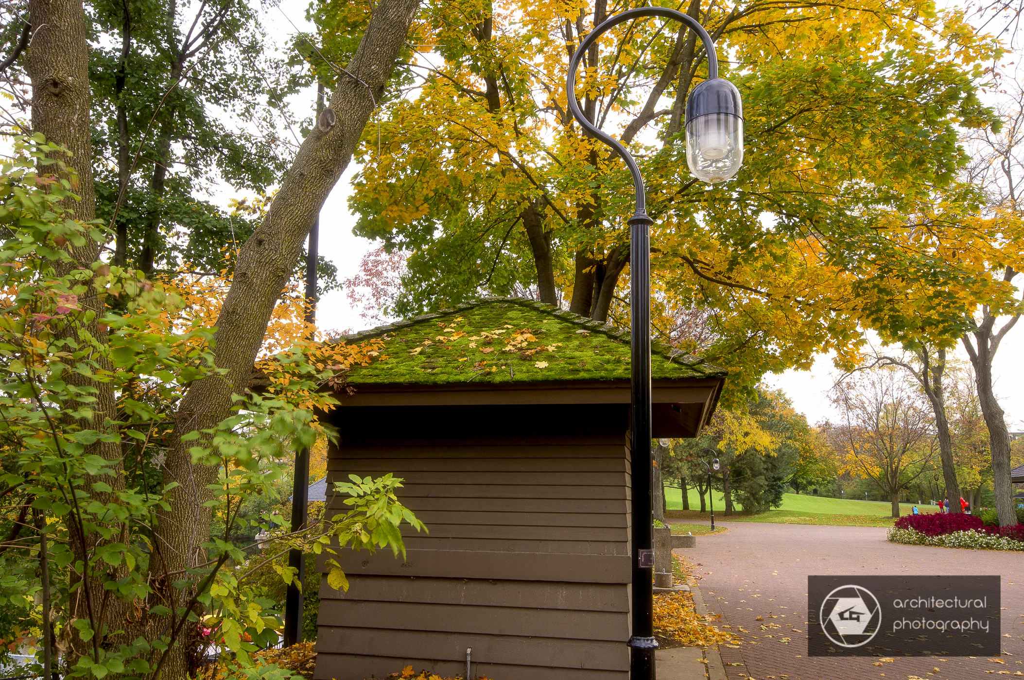Moss covered shed, Naperville Riverwalk